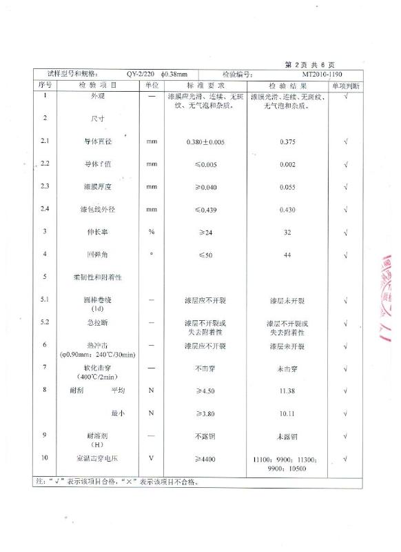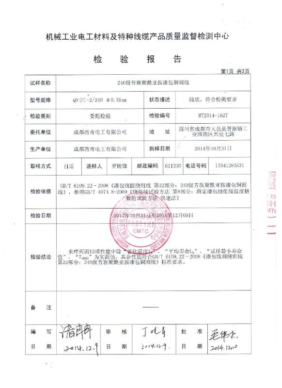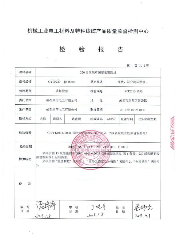我公司220級聚酰亞胺、240級芳族聚酰亞胺漆包銅圓線于2014年12月通過上纜所型式試驗,這代表著西南電工在聚酰亞胺漆包線領域取得了長足的進步。220級聚酰亞胺、240級芳族聚酰亞胺漆包線的產品特性為耐超高溫、超低溫、抗輻射、超負荷能力強,絕緣性能優異,使用領域將全面覆蓋航空航天、國防軍工、核能等多種特殊領域。