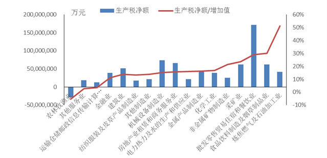 生產稅負擔較輕的行業包括運輸倉儲郵政信息傳輸計算機服務軟件業和其他服務業。由于特殊的行業性補助政策,農林牧漁業生產稅凈額為-2896億元,占增加值的-5.53%。